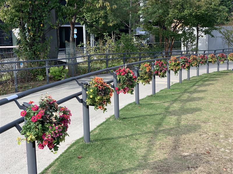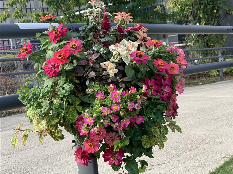 | 緑のマイスターが制作したハンギングバスケットと「脱炭素化ミニセミナー 花の寄せ植え体験」に参加された方と制作したオリジナルプランターで『花の小道』を作りました。 ☆ハンギングバスケットとオリジナルプランターの花の競演を是非、お楽しみください☆ |