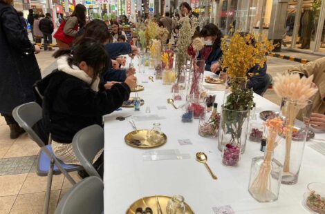 フラワーアレンジメントのワークショップを上通アーケード内で開催!参加者が、完成写真をとる用のパネルも設置予定。