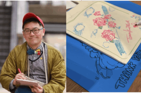 エコバック付き、プロのイラストレーターから似顔絵プレゼント!参加者されるお客様が、好きな花をモチーフにオリジナルエコバッグを描いている間に、イラストレーターが似顔絵を描いてプレゼントいたします。