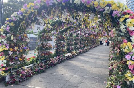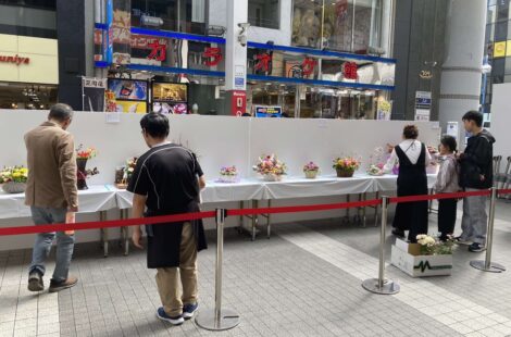 フラワーデザインコンテスト(生花のアレンジメント・生け花のコンテスト)の作品を街なかで展示いたします!