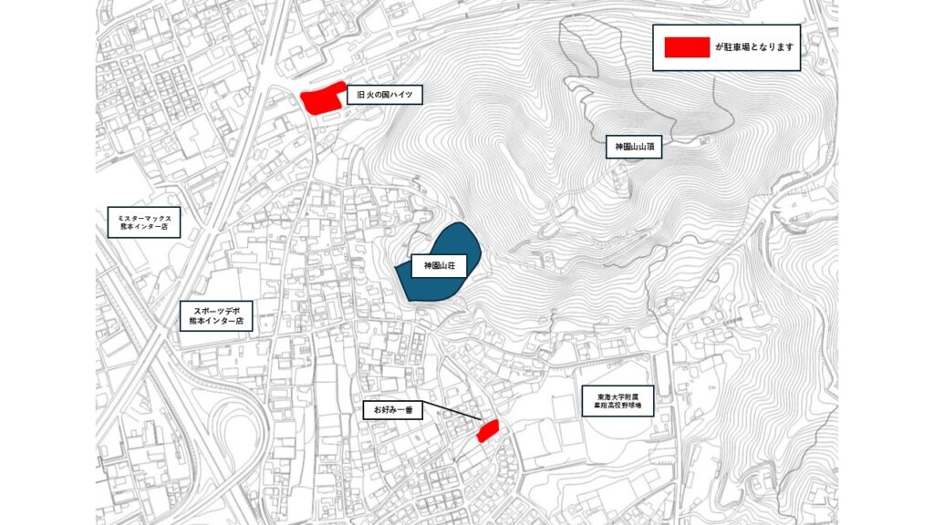 ②地図上右下の「お好み一番(熊本市東区神園2丁目9-30)」の駐車場につきましては22日(土)~24日(月・振)の3日間利用が可能です。